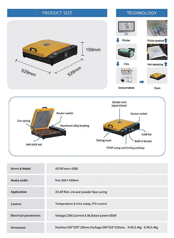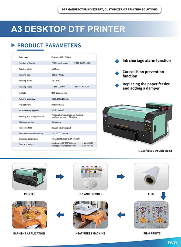 33cm nyomatszélességű tekercses asztali DTF nyomtató szet A3-as DTF sütővel. Kisebb és közepes grafikai stúdióknak tökéletes megoldás. Termelésre alkalmas ! 2db Epson i1600-as nyomtatófej ( nem XP600 !!! ), CMYKW. RIIP RIP szoftver. Stabil fólia továbbítás, hárompontos leszorítás, léptetés. Fólia kilépési ponton vákuumasztal a hullámosodás kiküszöbölésére. LCD panel az alapfunkcióknak. Kis helyigény, gyors megtérülés. Magyarországi szerviz, egy év garancia. Az ár tartalmazza az ingyenes betanítást, beüzemelést ( a Colorposter telephelyén ), 1 tekercs 33cm széles fóliát, első festékfeltöltést, 1kg ragasztóport.